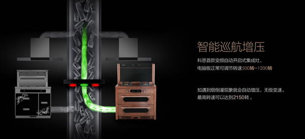 3、科恩首款變頻自動開啟式集成灶還有一個強大的智能化效果——消除CO殘留:當廚房環(huán)境超PM2.5限定值時自動把油煙抽吸凈化,當?shù)陀赑M2.5標準值時復位停止。