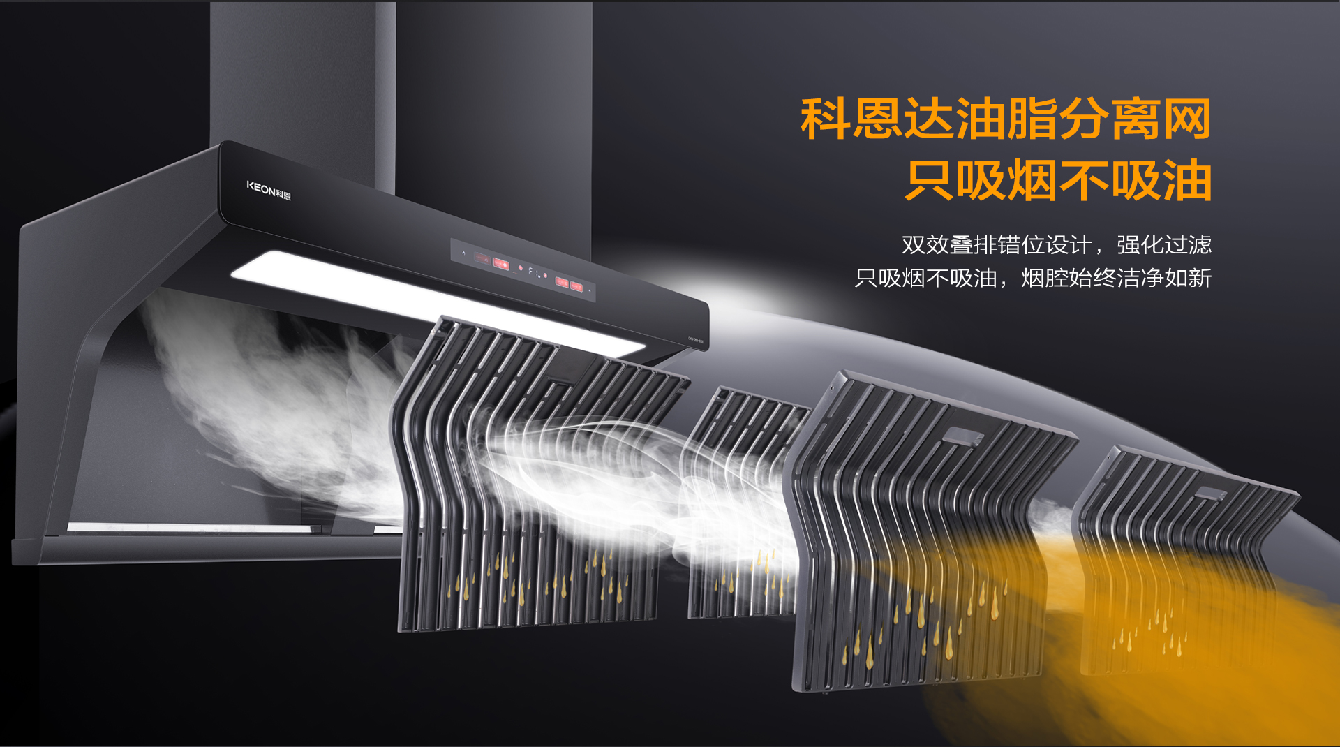 2023年,科恩免清洗煙機問世,科恩達網板再添核心技術,科恩達油脂分離網就此誕生。科恩達油脂分離網采用易潔太空壓鑄鋁材,經過酸洗-噴砂工藝加之特氟龍噴涂最后高溫燒結,不僅不沾油、易清潔更好打理。其采用獨特的多層疊排U型錯層結構設計,實現油脂分離度高達96%以上(第三方權威機構測定),它在高效解決油煙油脂分離和冷凝的同時,還能很好地起到阻燃隔火的效果,更好解決廚房安全隱患,徹底告別煙機內部清洗難題,保證煙機持久大吸力,延長煙機使用壽命。