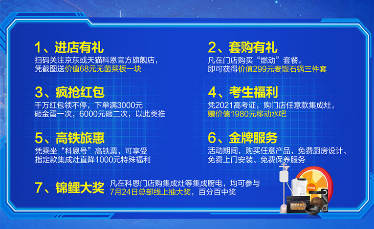 集成灶十大品牌、廚電行業(yè)十大品牌科恩燃動七月舌尖之旅——邂逅幸福美味,七大特權享不停,進店有禮:掃碼關注京東或天貓科恩官方旗艦店,憑截圖送價值68元無菌菜板一塊;套購有禮:凡在門店購買“燃動”套餐,即可獲得價值299元麥飯石鍋三件套;瘋搶紅包:千萬紅包領不停,下單滿3000元即可砸金蛋一次,6000元砸二次,以此類推;考生福利:憑2021高考證,購門店任意款集成灶,贈價值1980元移動水吧;高鐵旅惠:憑乘坐“科恩號”高鐵票,可享受指定款集成灶直降1000元特殊福利;金牌服務:活動期間購買任意產(chǎn)品,可享受免費廚房設計、免費上門安裝、免費保養(yǎng)服務;錦鯉大獎:凡在科恩門店購集成灶等集成廚電,均可參與7月24日總部線上抽獎。