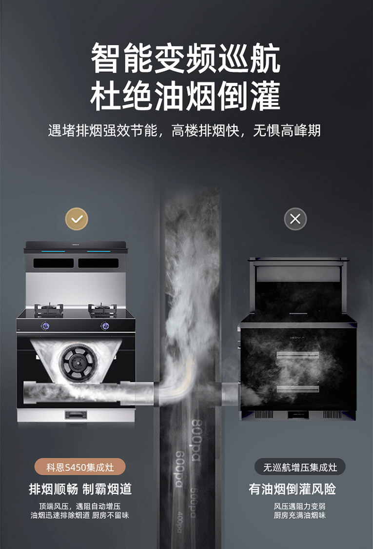 S450智能語音左右蒸烤集成灶采用20m3/min大吸力,720Pa大風壓,低空封鎖油煙升騰區,吸凈雙灶爆炒煙,搭載智能變頻巡航,遇堵排煙強效節能,高效排煙快,杜絕油煙倒灌。