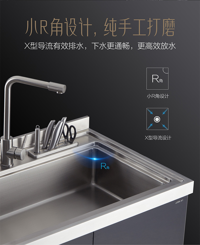 科恩集成凈洗中心,包含了X1(子母槽儲物柜款)、X2(雙槽儲物柜款)、X3(子母槽消毒柜款)、X5(雙槽超聲波消毒柜款)、X6(子母槽洗碗機十件套)產(chǎn)品。以集成水槽X1為例,堅持品質(zhì)選材,手工匠心鑄造,利用先進(jìn)科技打造高端品質(zhì),外觀設(shè)計精巧,折彎手工鑄造,一焊一接美觀大方,完美詮釋高端廚房格調(diào)生活。X1集成水槽集食材、水洗清潔、熱水系統(tǒng)、凈水系統(tǒng)、垃圾處理、收藏儲物為一體,多功能臺面設(shè)計,一切都變得如此的順手,水龍頭采用360°萬向設(shè)計,出水均勻,掌控自如。另外,X1在性能、品質(zhì)上都極為出眾,首先,900mm寬體設(shè)計,大水槽加寬加深,可移動式子水槽,單槽秒變雙槽,有效提高了水槽利用率,增加了廚房收納空間,X型導(dǎo)流流水,搭配小R角設(shè)計,應(yīng)用拉絲工藝,水槽干燥不積水,四條引水線,引導(dǎo)水流輕松下水。