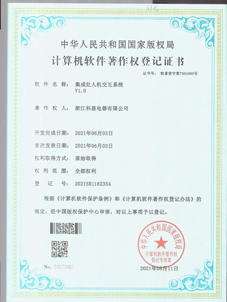 近日,由浙江科恩電器有限公司完全自主研發(fā)的集成灶人機(jī)交互系統(tǒng)V1.0軟件正式獲得國家版權(quán)局頒發(fā)的計(jì)算機(jī)軟件著作權(quán)登記證書。計(jì)算機(jī)軟件著作權(quán)是企業(yè)核心自主知識(shí)產(chǎn)權(quán),是企業(yè)的“無形資產(chǎn)”,是企業(yè)科技的生命力和價(jià)值所在。同時(shí),國家權(quán)威部門的認(rèn)證將使搭載這些軟件的產(chǎn)品價(jià)值倍增。此次集成灶十大品牌、廚電行業(yè)十大品牌科恩集成灶獲得計(jì)算機(jī)軟件著作權(quán),充分展現(xiàn)了企業(yè)強(qiáng)大的研發(fā)實(shí)力和核心競爭力。