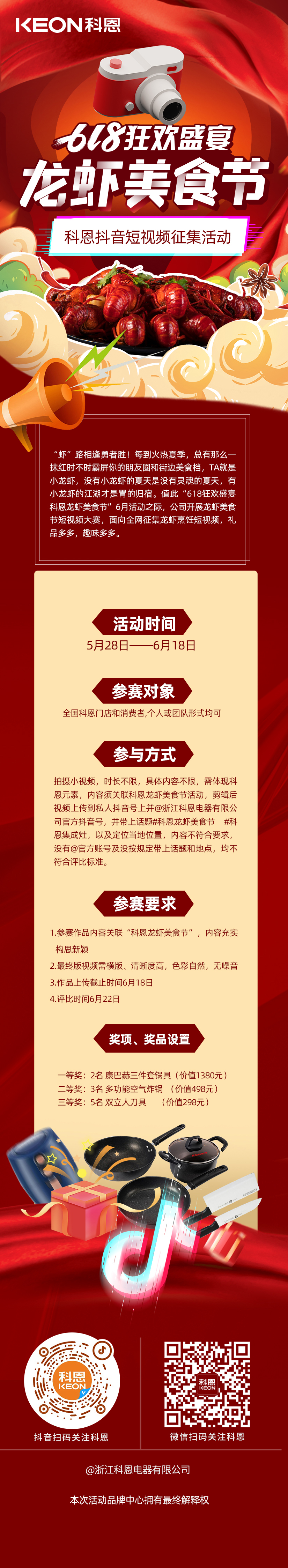 各位俠士,請(qǐng)妥存這份武林大會(huì)規(guī)則寶典,江湖美味,缺你不可!只要關(guān)聯(lián)科恩龍蝦美食節(jié),體現(xiàn)科恩元素并上傳至私人抖音號(hào),@浙江科恩電器有限公司官方抖音號(hào),帶上話題#科恩龍蝦美食節(jié) #科恩集成灶,定位當(dāng)?shù)乜贫鏖T店位置即可!