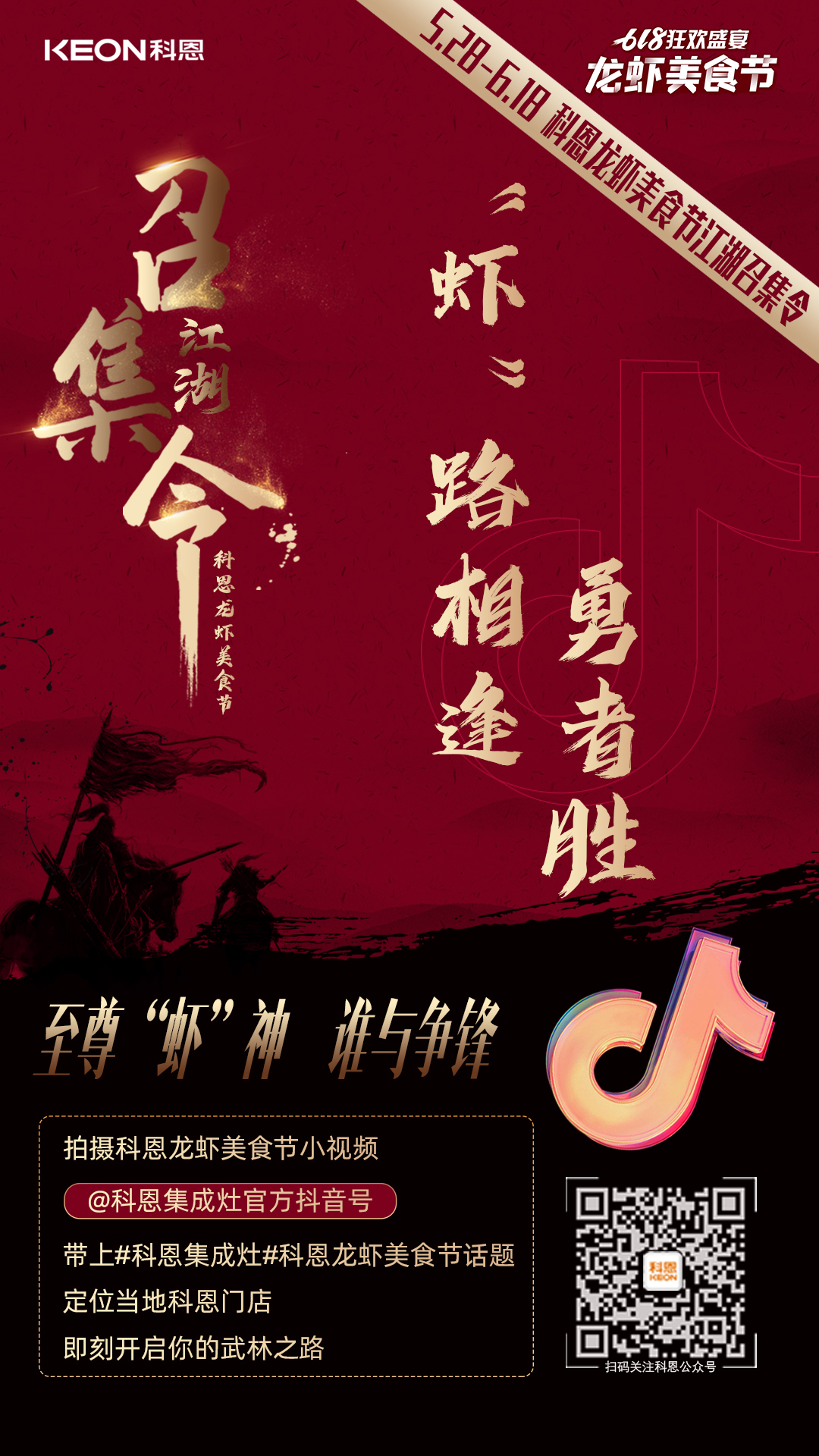 有人的地方就有江湖,有江湖的地方必有小龍蝦!有蝦有酒有江湖,快意人生,痛快自在!5月28日-6月18日科恩集成灶廣發(fā)江湖召集令,誠(chéng)邀天下俠士參加「科恩龍蝦美食節(jié)抖音短視頻大賽」,赴一場(chǎng)武林之約,角逐至尊“蝦”神之位!