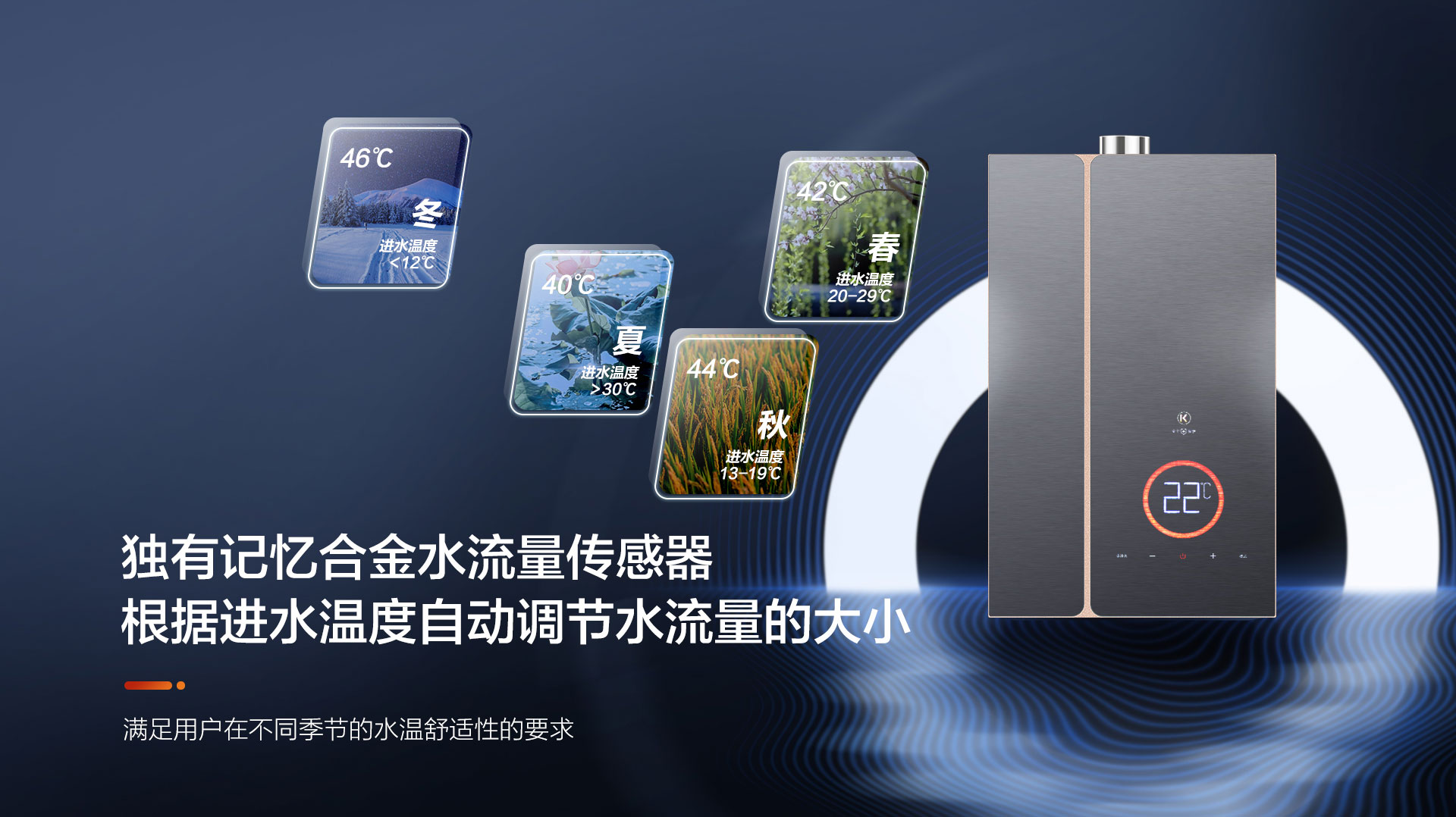 出水溫度不穩定,冬天水太冷,夏天水太熱!再加上全屋多點用水,水量忽大忽小,水溫忽冷忽熱,舒適沐浴的好興致全被打破!科恩18Q6零冷水燃氣熱水器獨有記憶合金水流量傳感器,可根據進水溫度自動調節水流量大小,滿足用戶在不同季節的水溫舒適性的要求,新穎LED七彩顯示屏,搭載AI智控系統,一鍵精準恒溫,快捷便利。
