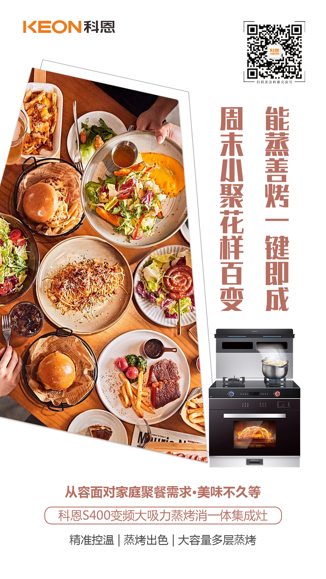 親友聚餐,想露一手奈何卻是廚房小白,是時候打開科恩S400, 享受一下“廚藝大師”的主角光環了!73L大容量可視腔體,從容面對家庭聚餐需求,一腔搞定八菜一湯,十大模式智能蒸烤,自由發揮烹飪創意,火候、溫度、時間,一鍵搞定!