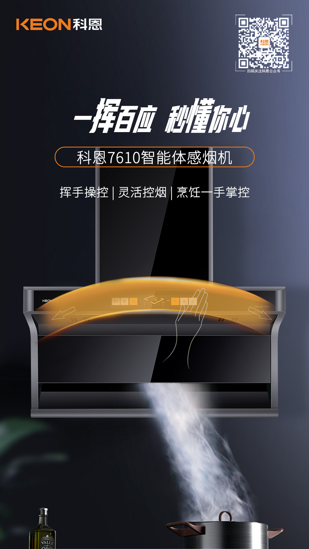 科恩7610頂側雙吸智能體感煙機,吸力更勝一籌!