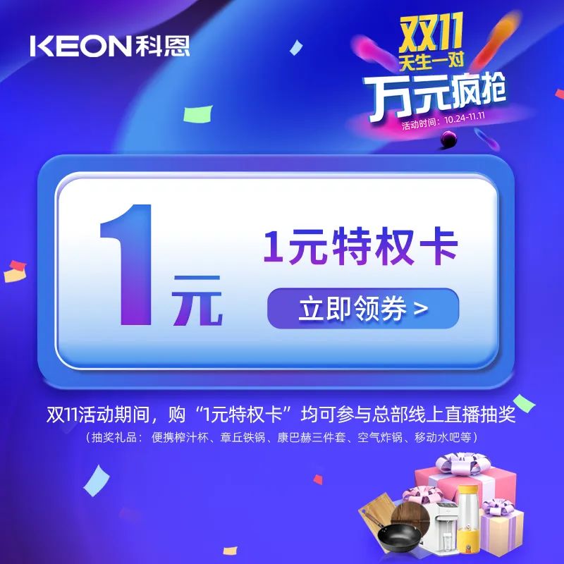 雙十一活動期間,凡購1元特權卡即可參與總部線上直播大抽獎,便攜榨汁杯、章丘鐵鍋、康巴赫三件套、空氣炸鍋、移動水吧等萬元豪禮送不停