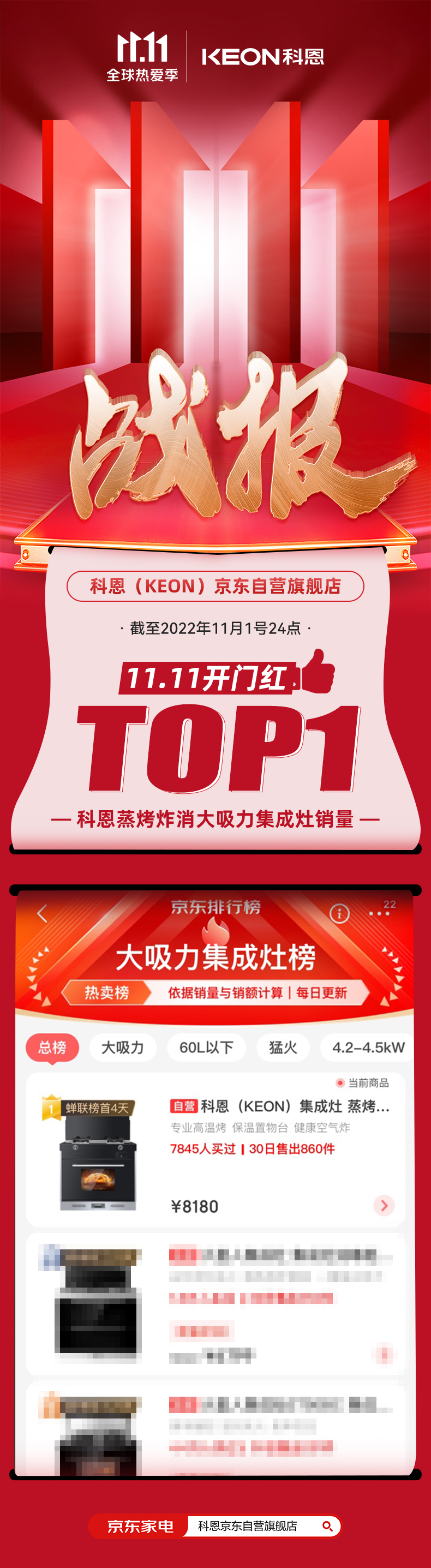 科恩雙11開門紅戰報正式出爐,截止2022年11月1日24點,雙11開門紅開搶28小時,科恩集成灶榮登大吸力集成灶榜TOP1,實力登榜,權威見證!