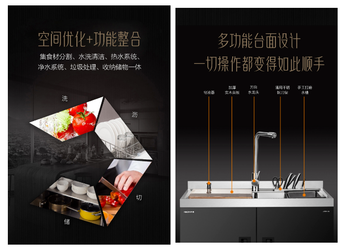 空間優(yōu)化+功能整合,集食材分割、水洗清潔、熱水系統(tǒng)、凈水系統(tǒng)、垃圾處理、收納儲物于一體,多功能臺面設計,皂液器、加厚實木菜板、萬向水龍頭、通用不銹鋼刀架、手工打磨水槽等功能,每一處細節(jié)堪稱完美,整體造型優(yōu)美別致,同時兼顧實用性。