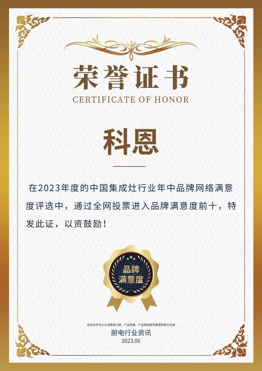 本次榮獲“2023年度中國(guó)廚電行業(yè)品牌年中網(wǎng)絡(luò)滿(mǎn)意度前十”、“2023年度中國(guó)集成灶行業(yè)品牌年中網(wǎng)絡(luò)滿(mǎn)意度前十”,再次印證了行業(yè)及消費(fèi)者對(duì)科恩的認(rèn)可,未來(lái)科恩將繼續(xù)秉持初心以產(chǎn)品為原點(diǎn),深耕行業(yè)。以為中國(guó)家庭打造智慧廚房生活,及推動(dòng)中國(guó)廚電行業(yè)發(fā)展繼續(xù)前行!