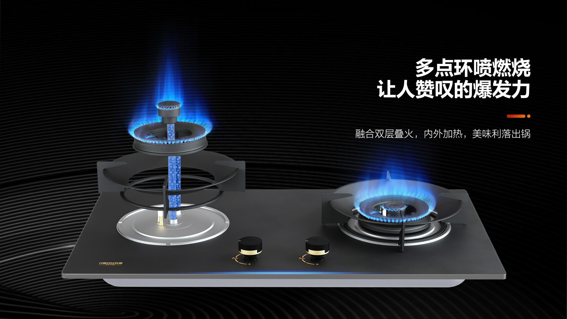 科恩金剛防爆灶采用多點環噴燃燒+雙層疊火,內外加熱,寬域火位調節,輕松應對各式菜品烹飪火力,讓每一道菜都找到屬于它的最佳火候!