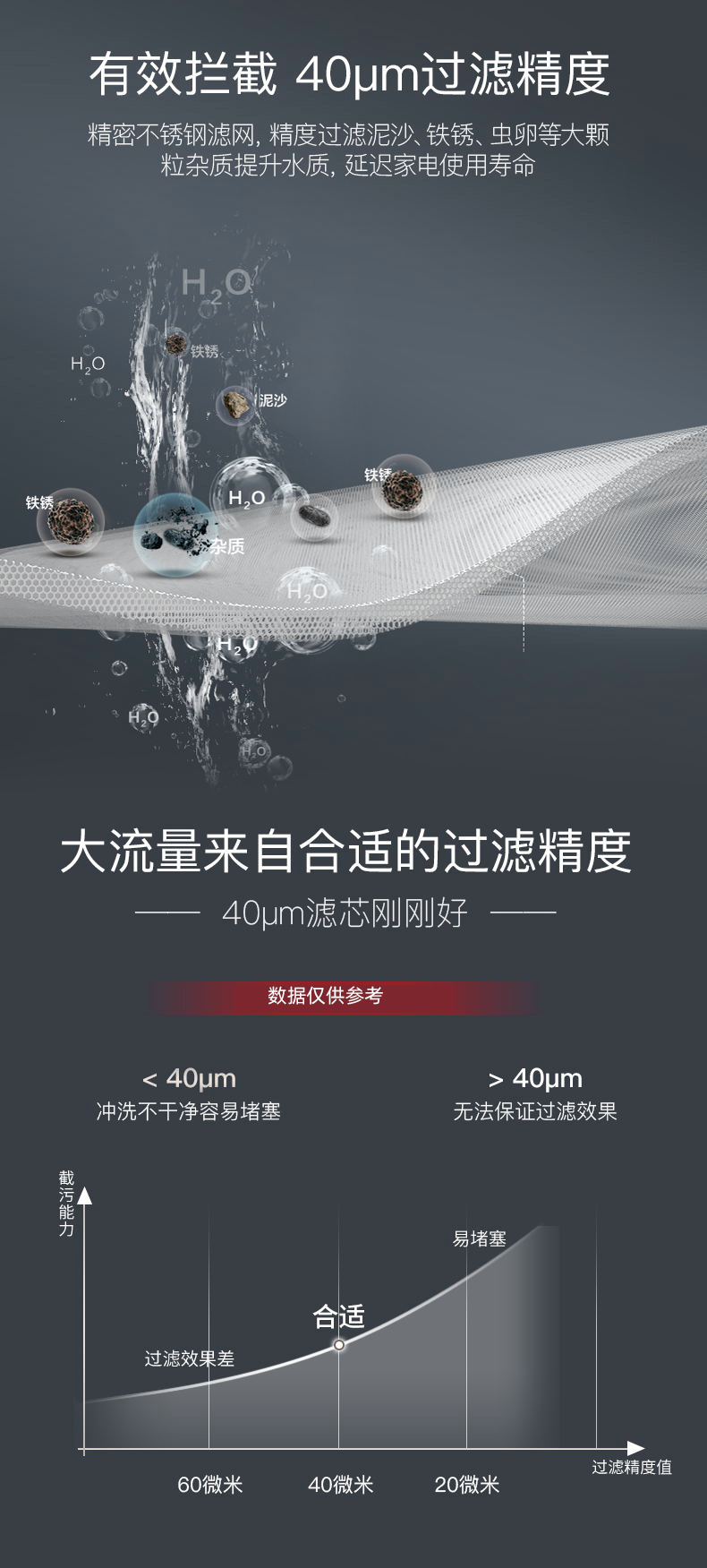 同時,Q30采用40um過濾精度,精密不銹鋼濾網,精度過濾泥沙、鐵銹、蟲卵等大顆粒雜質,提升水質,延長家電使用壽命,完美解決新小區洗衣機進砂石的煩惱。
