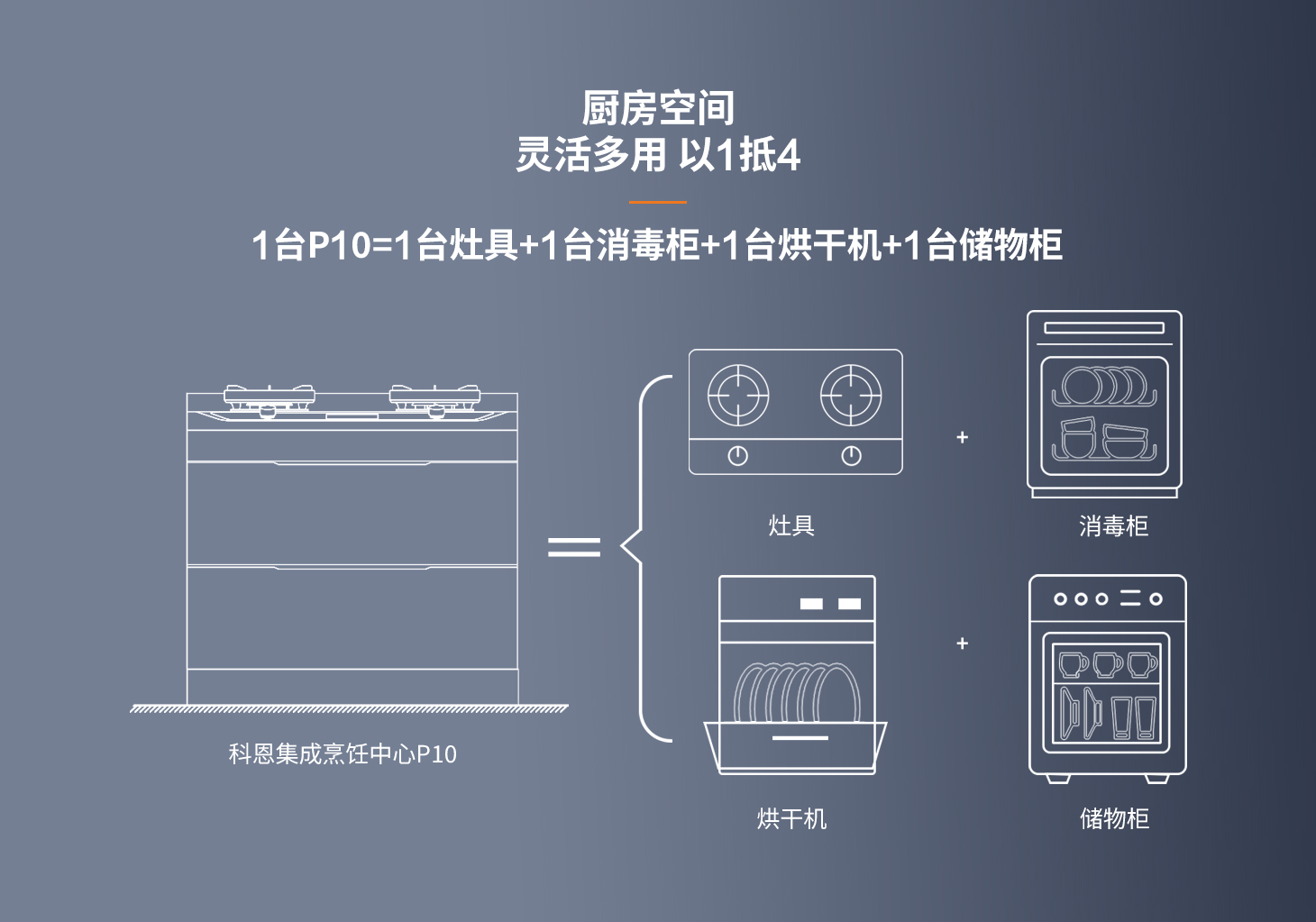 空間革命,小戶救星。告別傳統(tǒng)廚房束縛,解決刻板安裝限制。科恩新品集成烹飪中心p10,0.5個(gè)立方,化繁為簡。空間釋放,不占櫥柜空間;主柜清爽,不積油免清洗上烹下凈立體空間全能集成