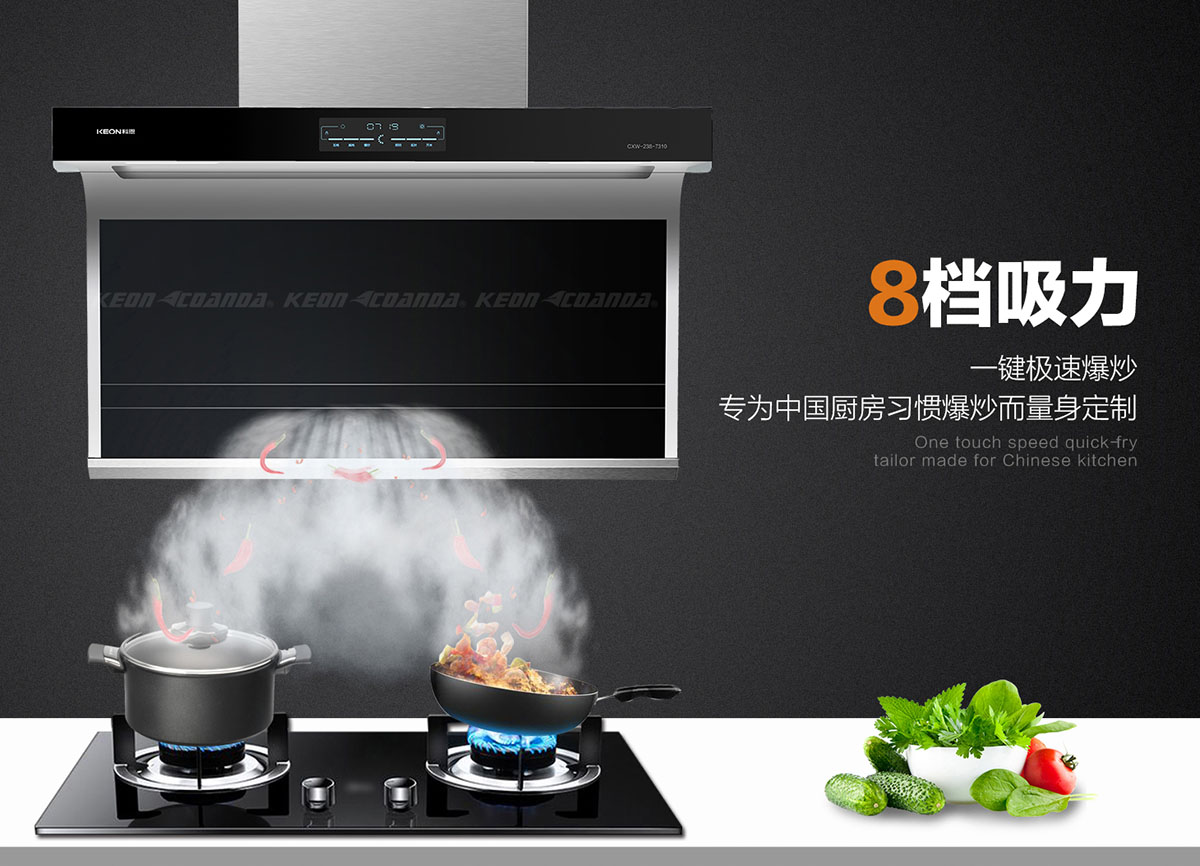 - 一鍵爆炒,8檔吸力,專為中國廚房習慣爆炒而量身定制。