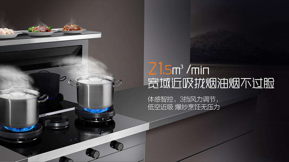 - 一級(jí)能效,21.5m3/min寬域近吸攏煙,油煙不過(guò)臉,烹飪更隨心