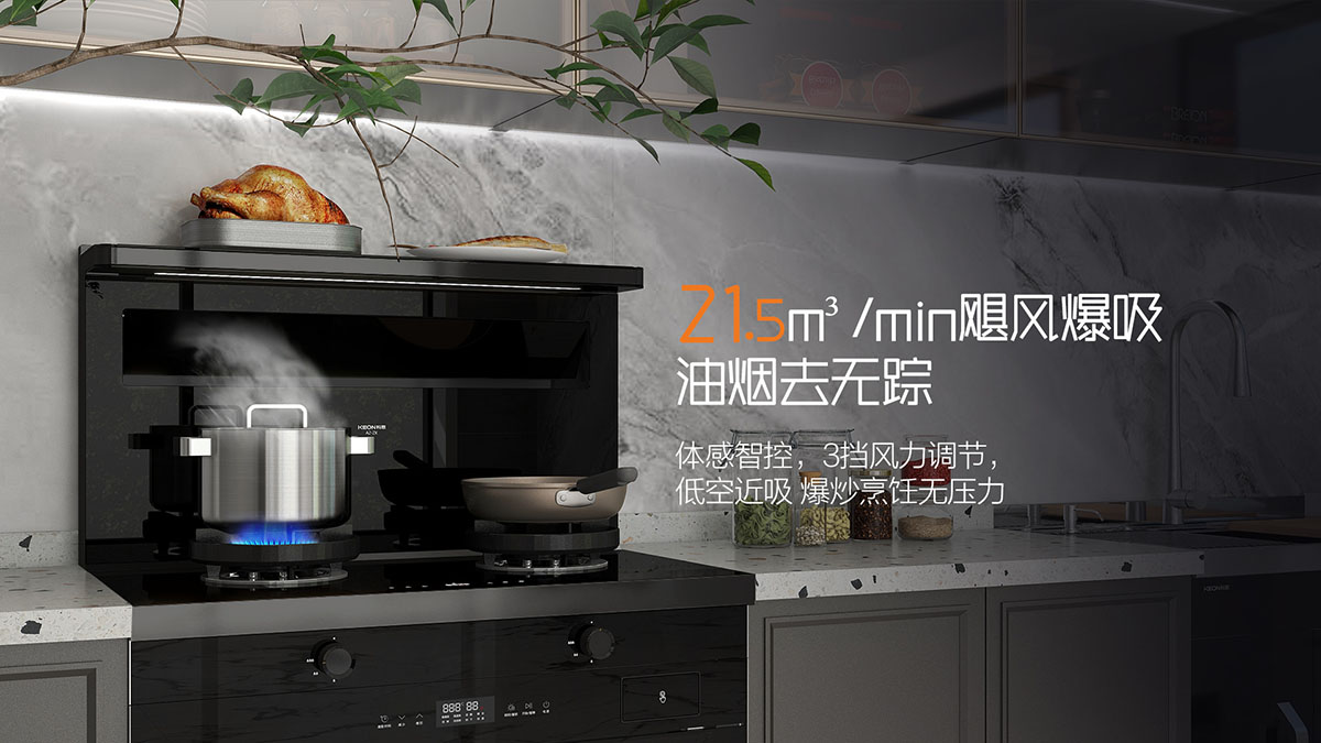 • 21.5m3/min寬域爆吸攏煙,油煙0逃逸