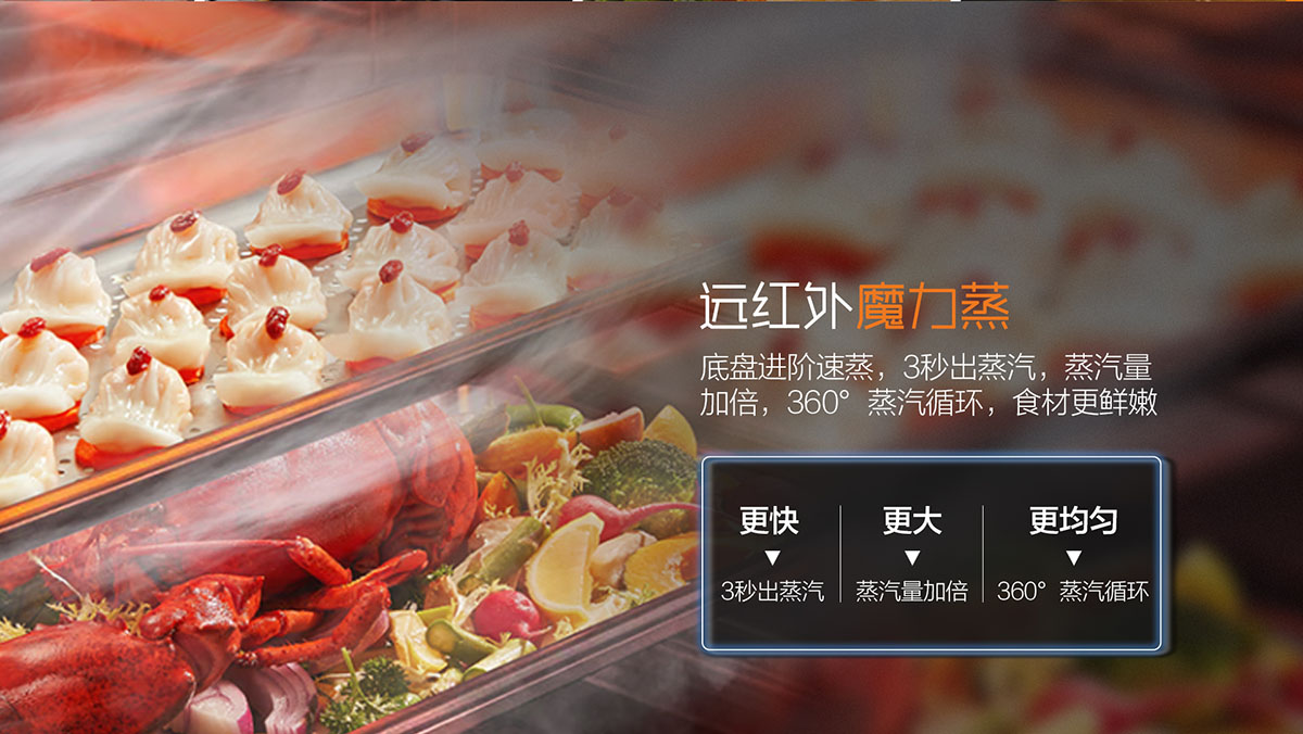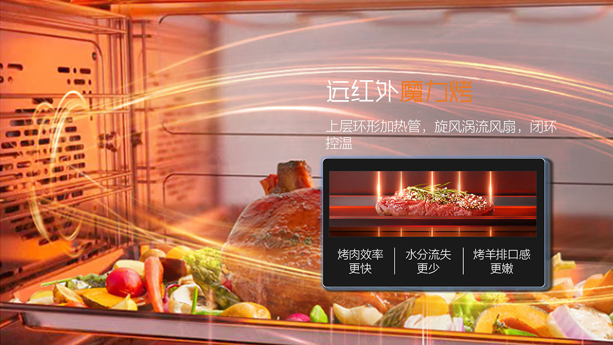 • 大容量蒸烤箱,120℃高溫快蒸,360〫立體炙烤