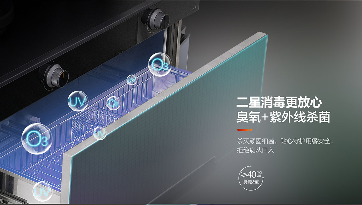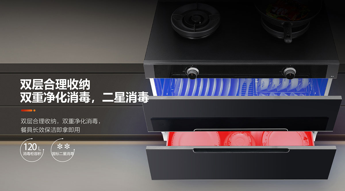 • 120L大容量消毒柜,采用臭氧與紫外線雙重消毒