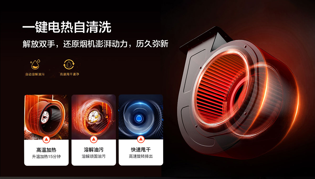• 一鍵電熱自清洗,解放雙手,還原煙機澎湃動力,歷久彌新