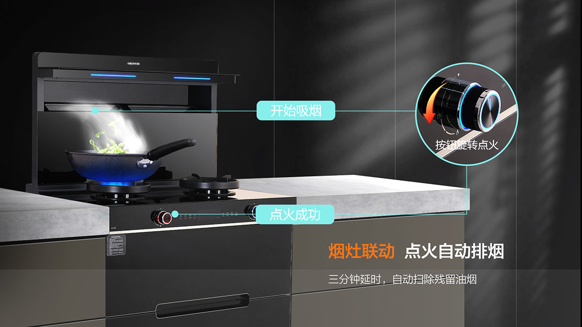 - 煙灶聯(lián)動(dòng),點(diǎn)火自動(dòng)排煙,三分鐘延時(shí),自動(dòng)掃除殘留油煙