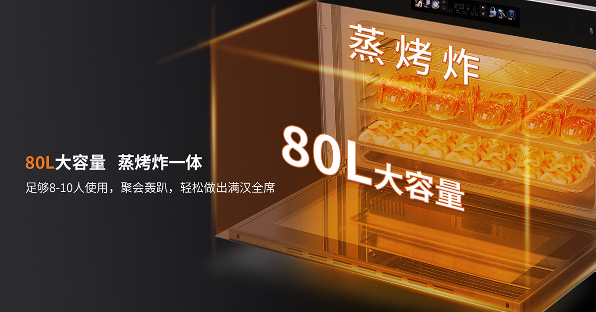 • 80L大容量,蒸烤炸一體,足夠8-10人使用,輕松做出滿漢全席