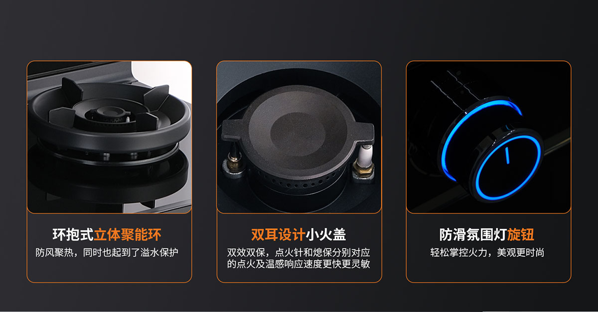 • 環(huán)抱式立體聚能環(huán),防風(fēng)聚熱,同時也起到了溢水保護(hù)