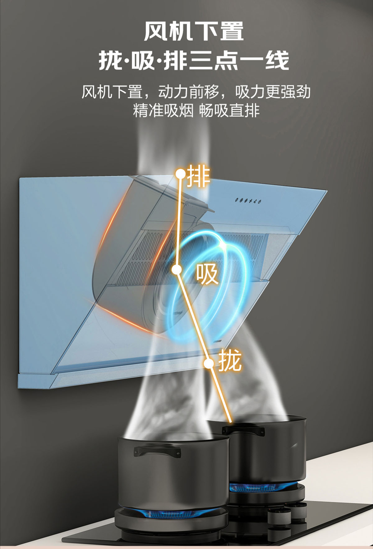 • 攏、吸、排三點一線,暢吸直排,高效凈煙